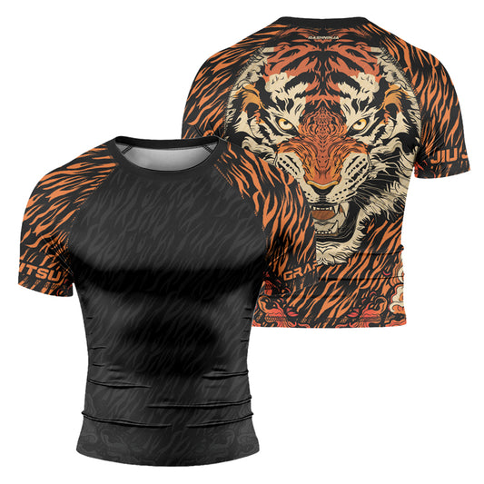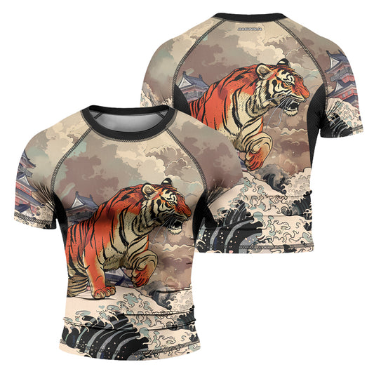 Rashninja Tiger Temple Wave Black Orange Men's Short Sleeve Rash Guard Our men's compression shirt...