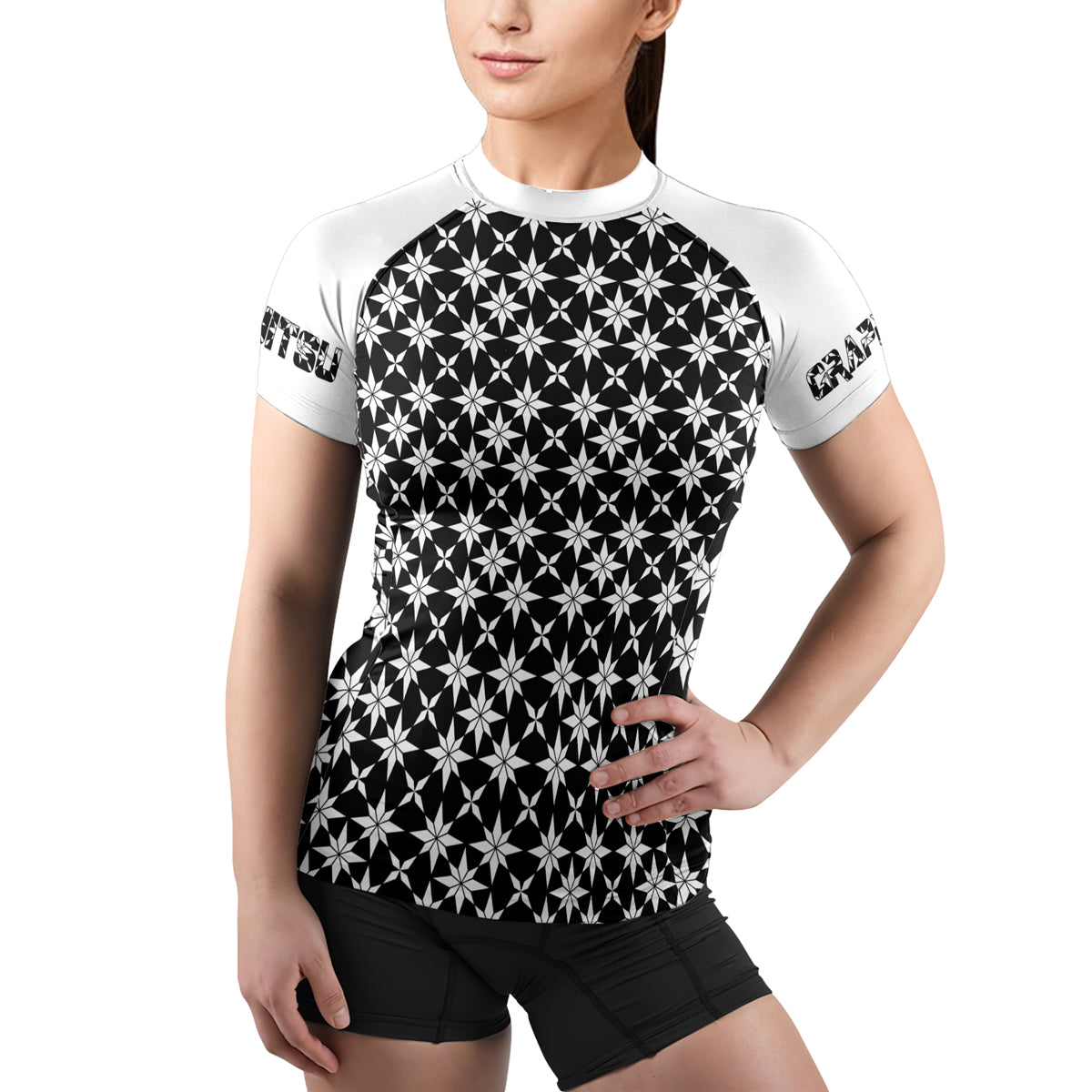 Our women's short sleeve compression shirt is made with a high-performance blend of 85% Polyester and 15% Spandex, providing a sleek and flexible fit that enables unrestricted motion during any workout or martial arts training.
