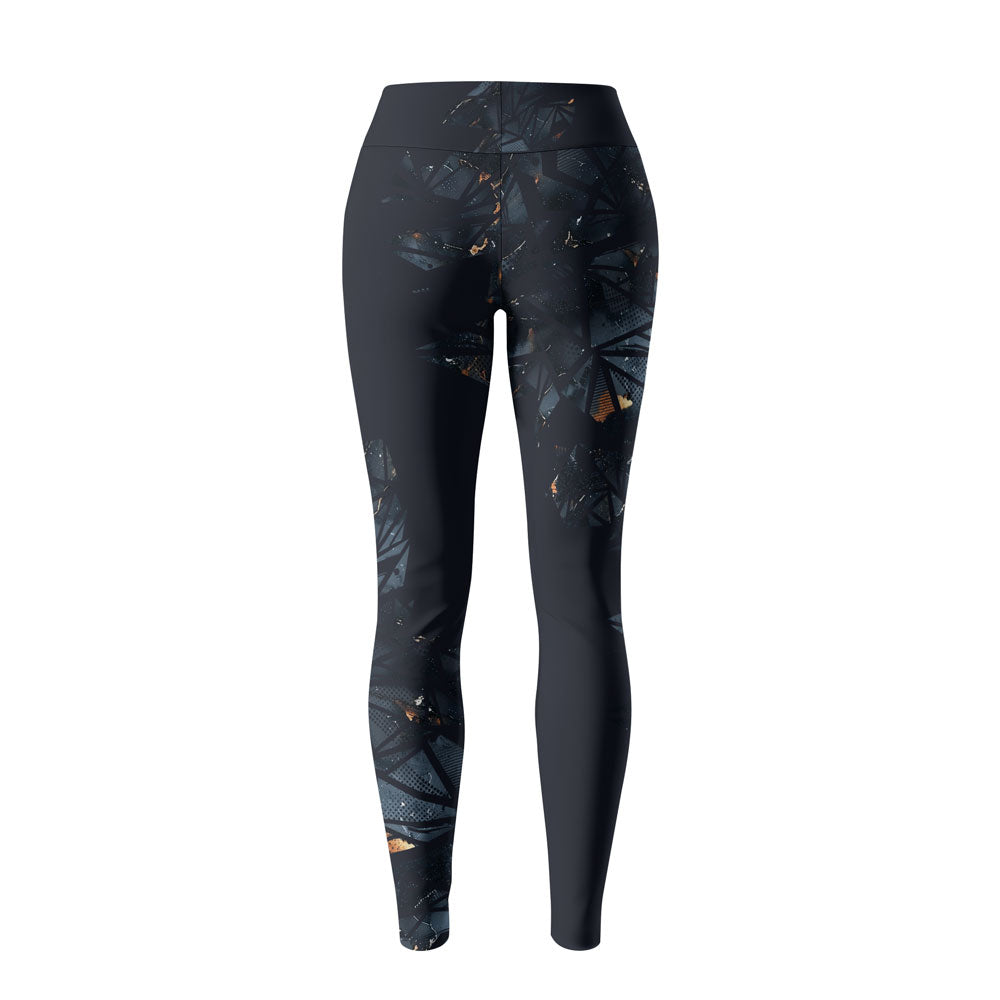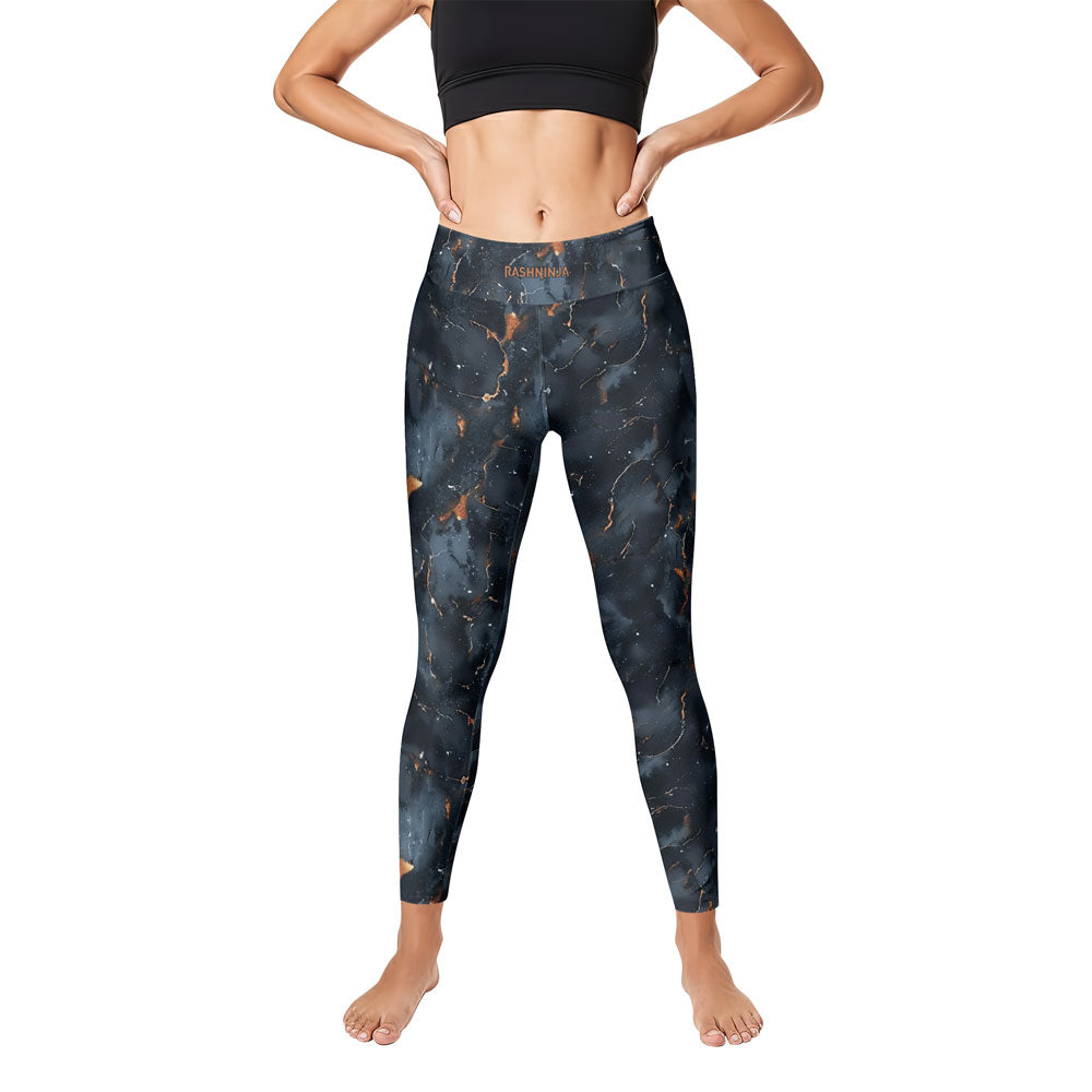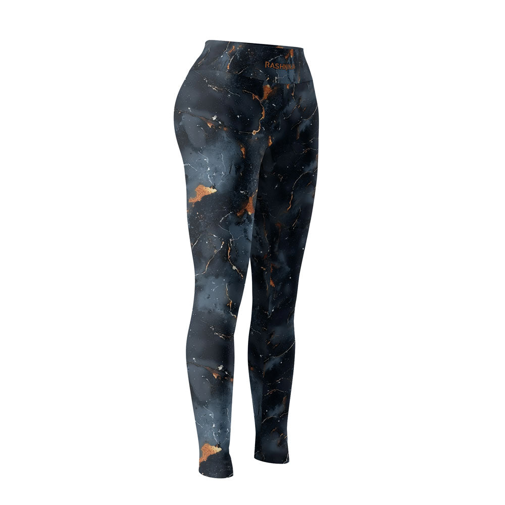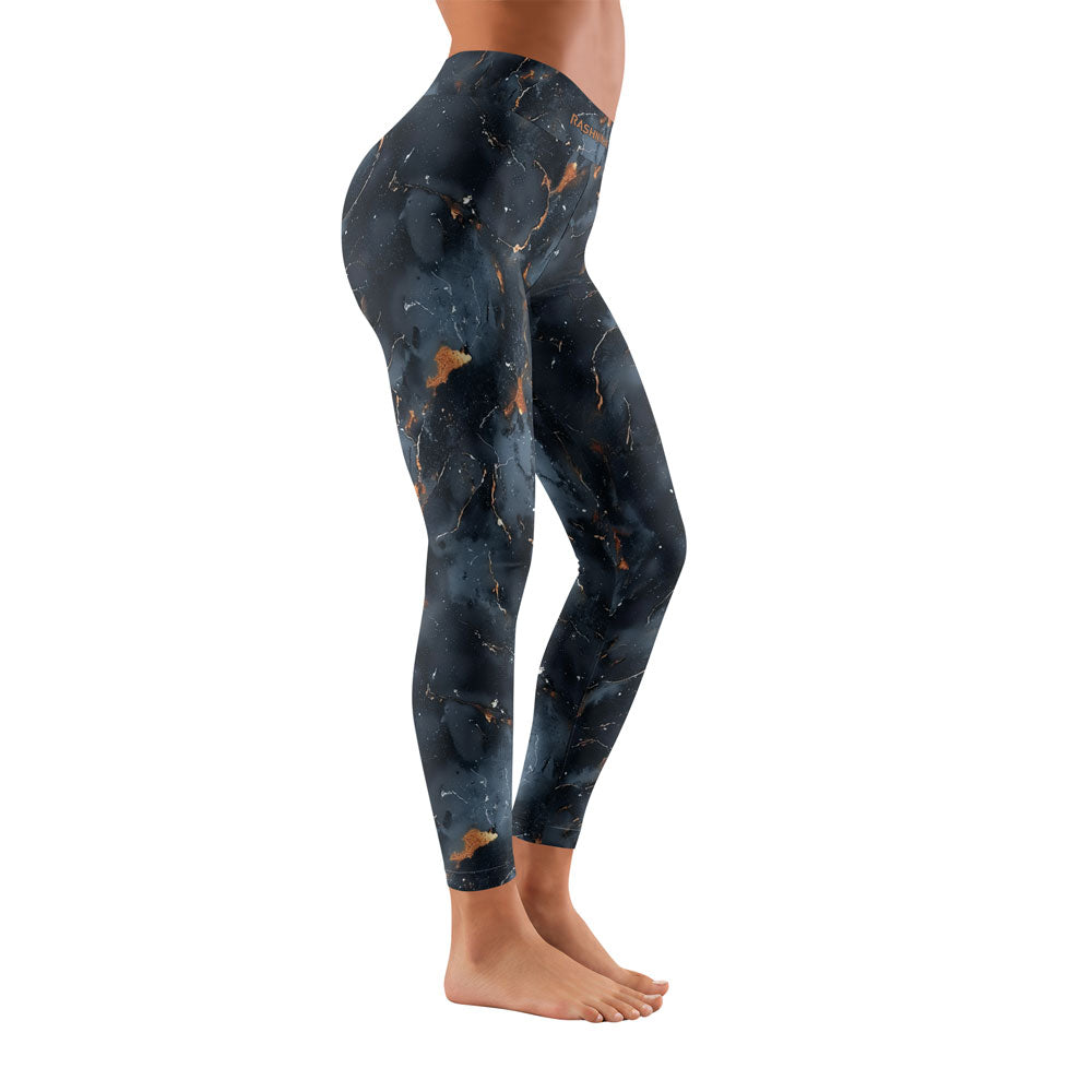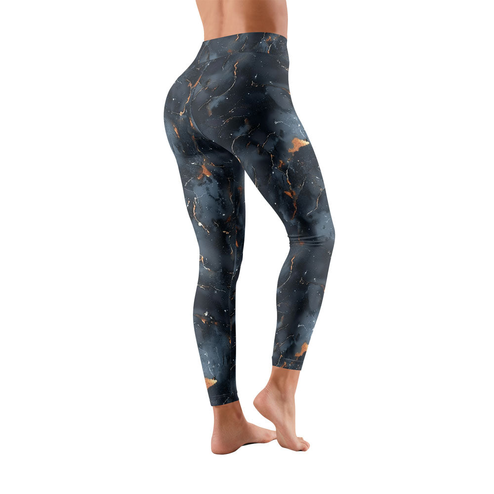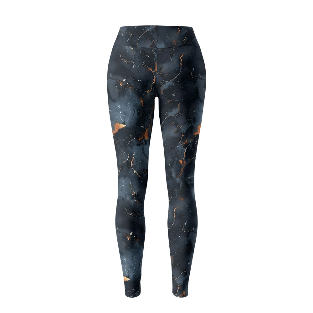 Featuring a stunning abstract marble pattern in deep navy, icy blue, and molten gold accents, these leggings combine eye-catching style with serious functionality.