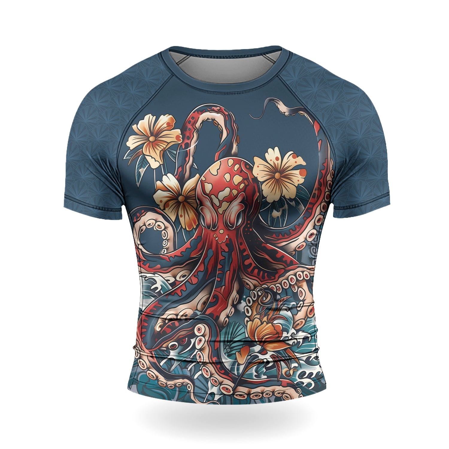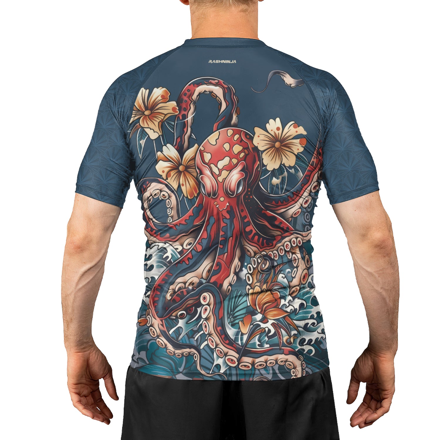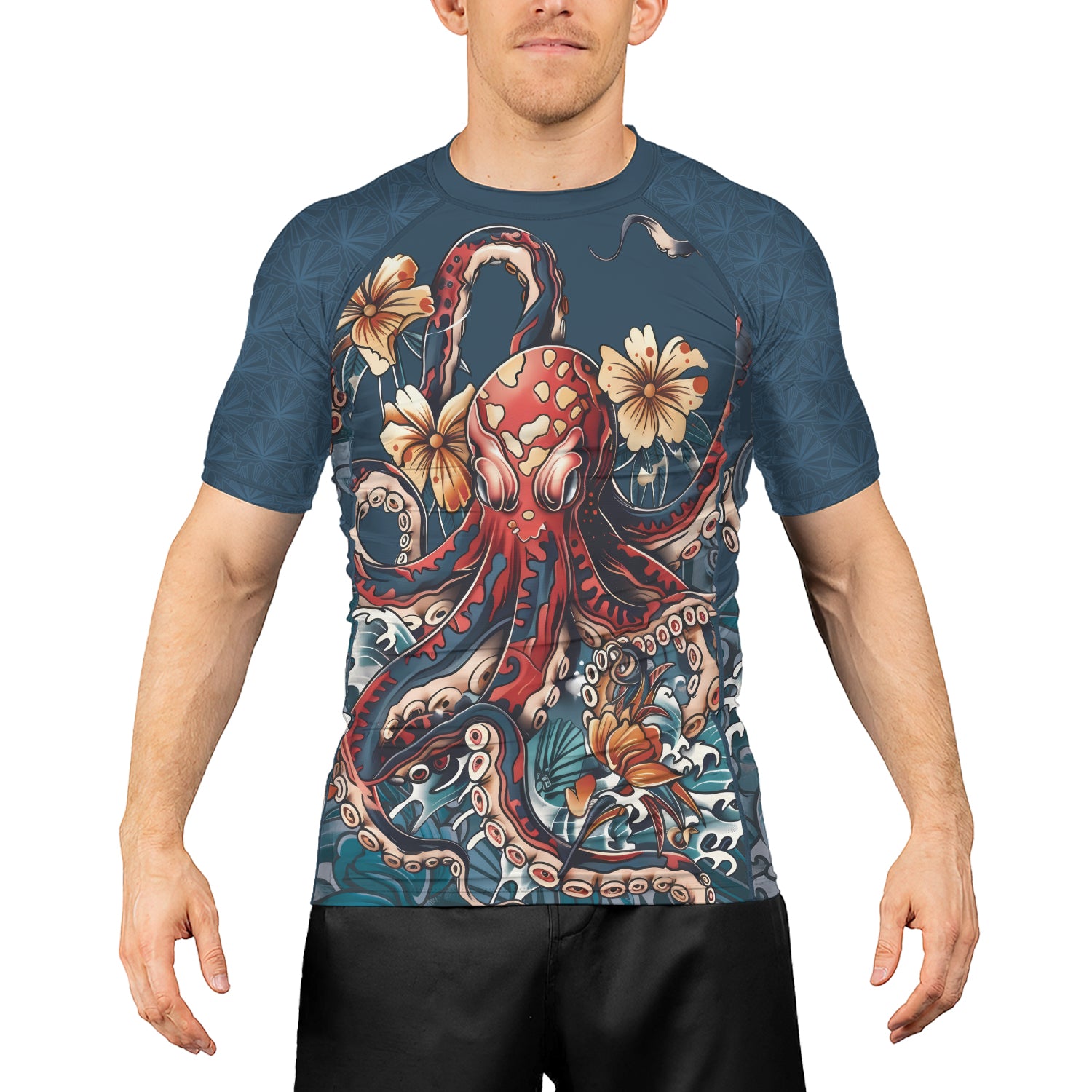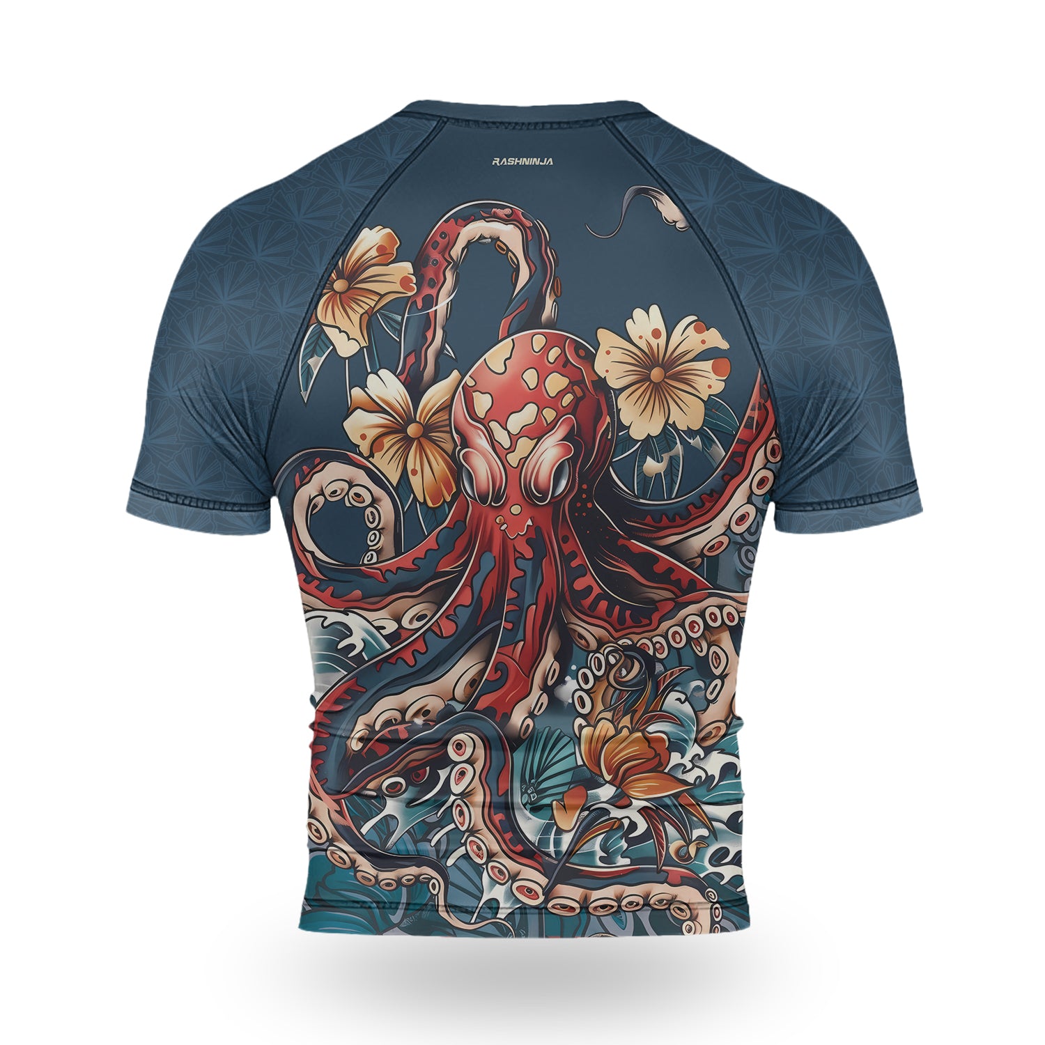Rashninja Octopus Floral Blue Men's Short Sleeve Rash Guard